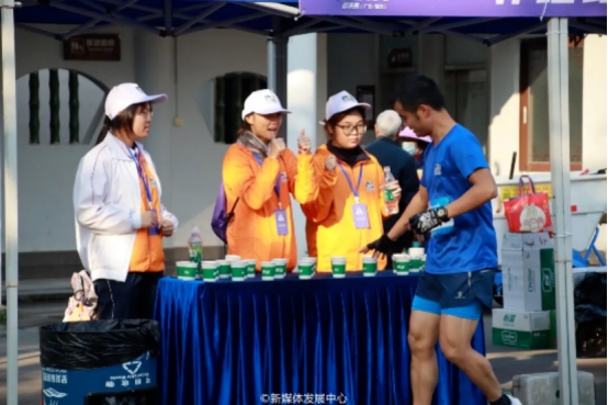 //志愿者在终点拱门处为冲线运动员佩戴奖牌//
