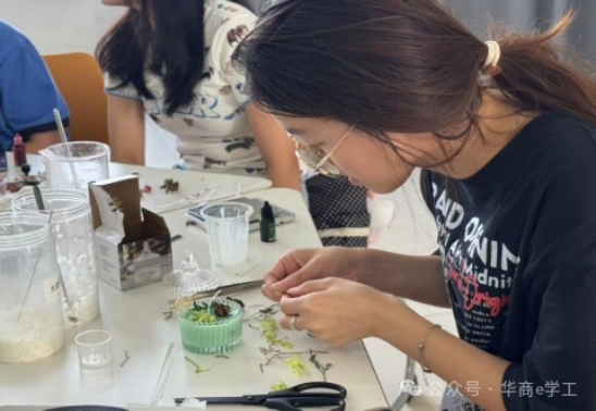 生活最动人的当然属于亲手创作环节,这正是“四会八能”中“会实践、会合作”的鲜活体现。同学们手持试纸细嗅五种香料,在交流中碰撞香方灵感;按配比称量蜂蜡与大豆蜡、耐心等待融化、精准倒入模具调色,每一步都藏着“精益求精”的华商态度;提前裁剪干花、待蜡液凝固时细心摆盘,指尖的专注里,是对“美”的追求与创造。刘老师携香薰教师团队全程在旁指导,既保障了实践安全,更用耐心传递着书院“因材施教”的育人温度。