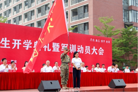 庄严的授旗仪式上,学校党委书记陈玉欢教授向军训团团长授予团旗。旗帜所指,心之所向。在它的引领下,2025级新生将迈开坚定的步伐,在汗水与坚持中淬炼成长,在纪律与荣誉中塑造品格。