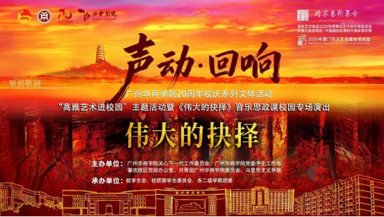 为迎接广州华商学院20周年校庆,深入推动高雅艺术与思政教育融合创新,10月21日下午,声动·回响——“高雅艺术进校园”主题活动暨《伟大的抉择》音乐思政课校园专场演出在四会剧院圆满落幕。我校近500名师生代表参与本次活动。