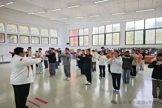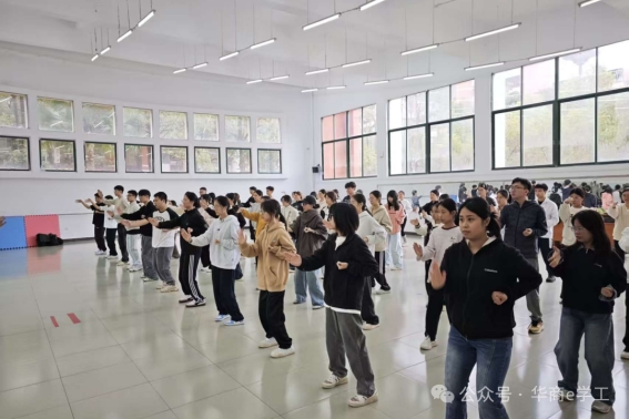 教学过程中,陈会长从最基础的“抱拳敬礼”动作教起,耐心纠正每一位学员的姿势:“摊手”时需精准把控手腕角度,“标指”讲求发力流畅连贯,“马步”则强调膝盖内扣蓄力。原本略显生涩的动作,在他的拆解与示范下,逐渐变得流畅起来。同学们认真模仿、反复练习,有的额头渗出了汗珠,却依然眼神专注;有的互相提醒动作细节,课堂氛围既认真又热烈。这一幕生动诠释了“一站式”学生社区与党委武装部举办活动的初衷——以实践体验为载体,让同学们在“动起来”的过程中强健体魄、锤炼意志,正是“五育并举”中“体育”与“德育”的深度融合。
